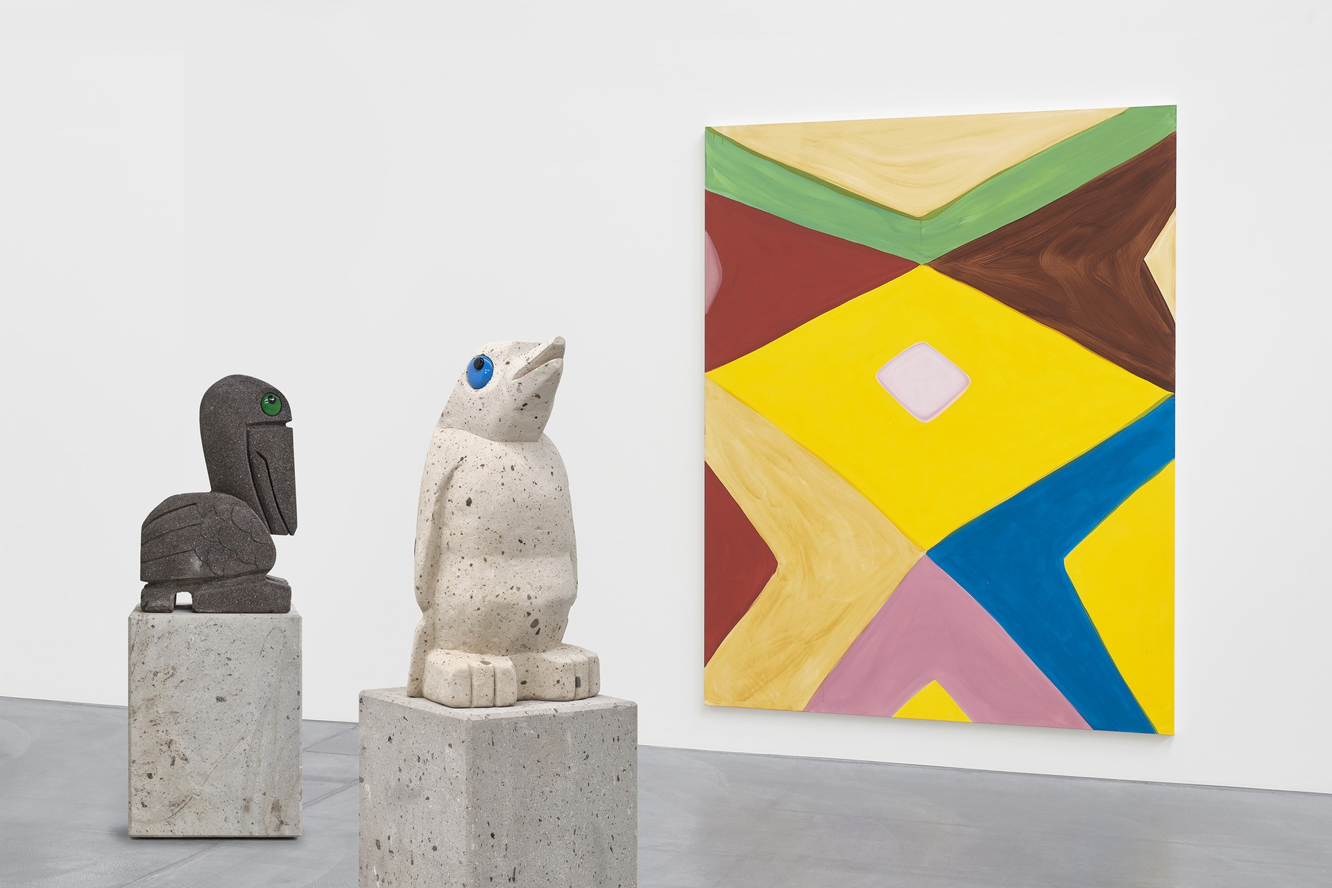 Image: Installation view, f.l.t.r., Olaf Breuning, Pelican’s Sister and Bird (both 2024), and Marina Adams, Cedar of Lebanon, 2023.