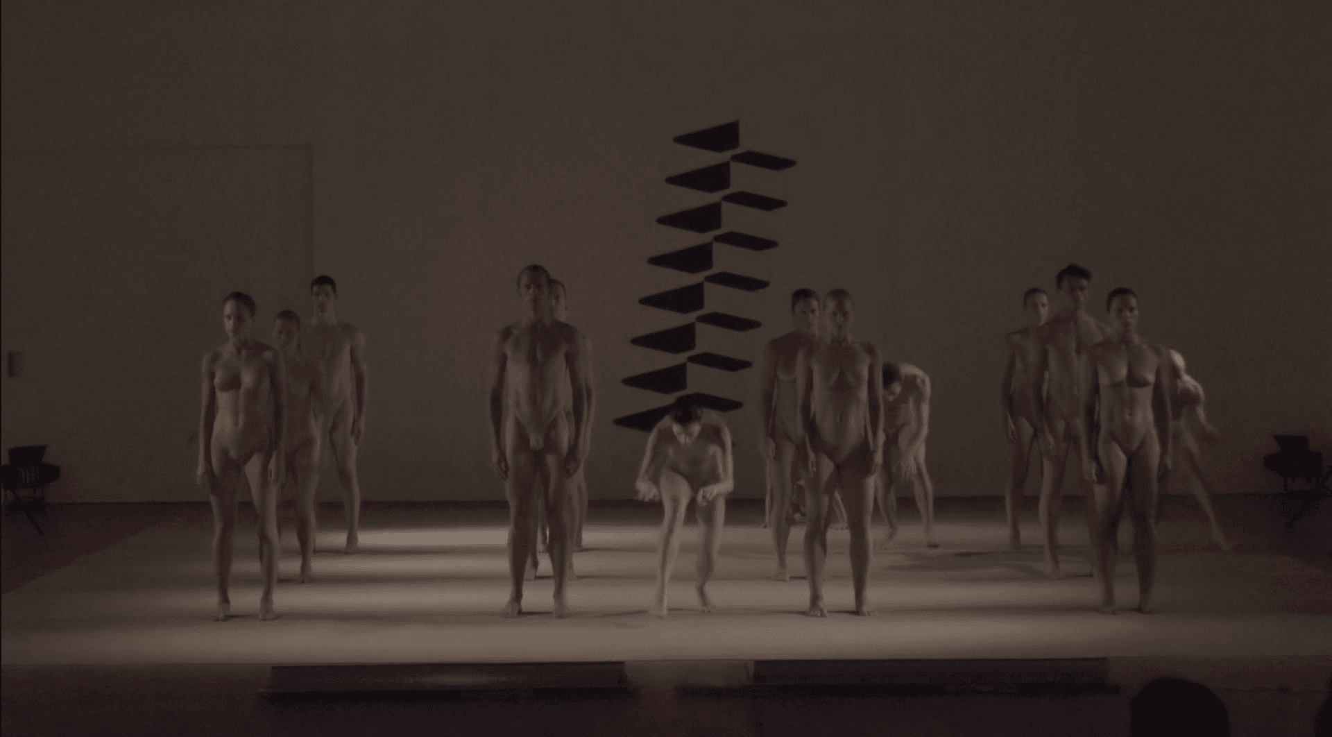 INDUSTRIAL SEAGRASS is a dance-theater-piece with the characteristics of an installation, in which one dancer is moving among a mass of 15 other dancers.