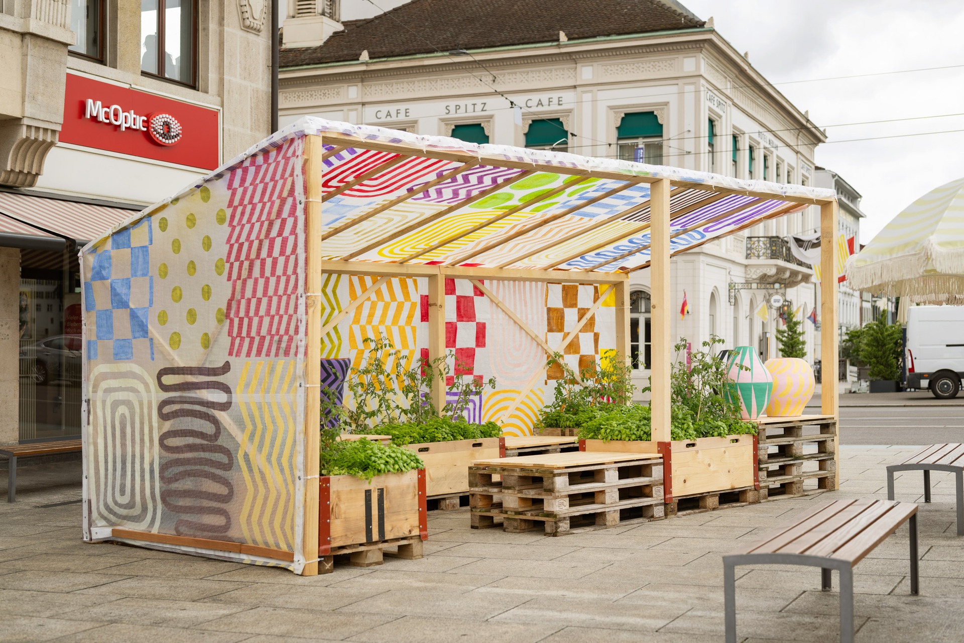Integrated into the installation are clay vessels painted with simple motifs and rudimentary forms such as rhomboids, triangles, and zigzags, alluding to Galiciadis’s interest in modernist architecture and design by Le Corbusier to Charlotte Perriand, and their vision that design could improve everyday life and change society. At Parcours, the installation offers visitors moments of retreat among plants that have been selected from a local nursery and brought to the city center for a week, after which they will be returned.