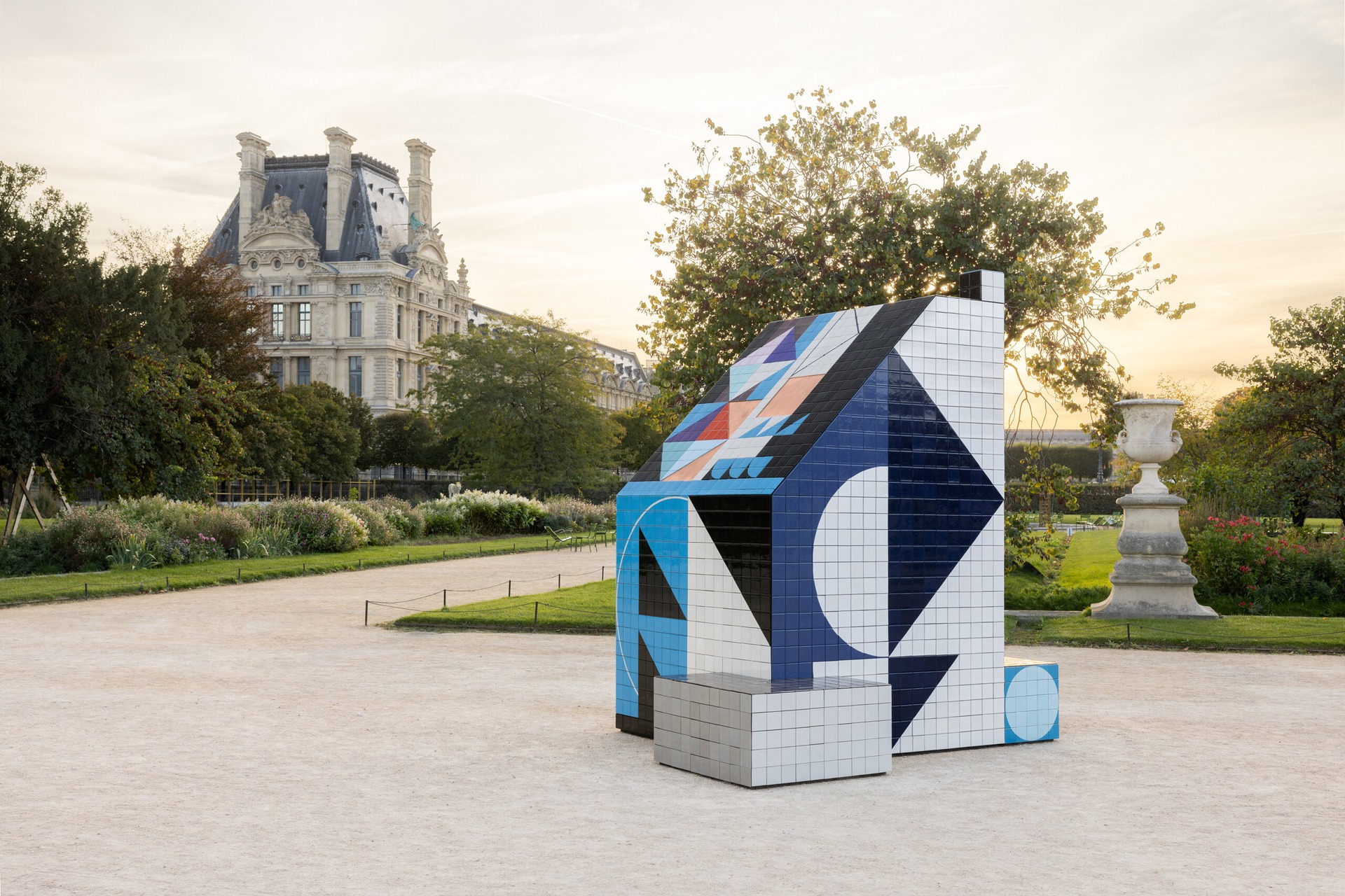 Wieser’s title for the work, *But round my chair the children run, *a line from Oscar Wilde’s 1885 poem Le Jardin des Tuileries, again is an onomatopoeic tribute to the interaction of the sculpture, that can be used to sit, and its surroundings, children playing in the park.The monolith’s surface is compiled of roughly 2000 hand-glazed tiles imposing a colorful mosaic of geometrical shapes or an abstract painting when seen from a distance. The composition is complemented by polished copper plates reflecting the sunlight and capturing the dynamic movement of the city and flâneurs in the park. Wieser’s attention to detail is evident in each tile she designs, bearing traces of her meticulous brushstrokes: another reference to the past and a celebration of what was once a handcraft decorating the homes and palaces of the privileged to the wealthy. This dialogue between past and present sparks new interpretations, encouraging viewers to contemplate the relationship between art, architecture, and nothing less than the history of Paris itself.