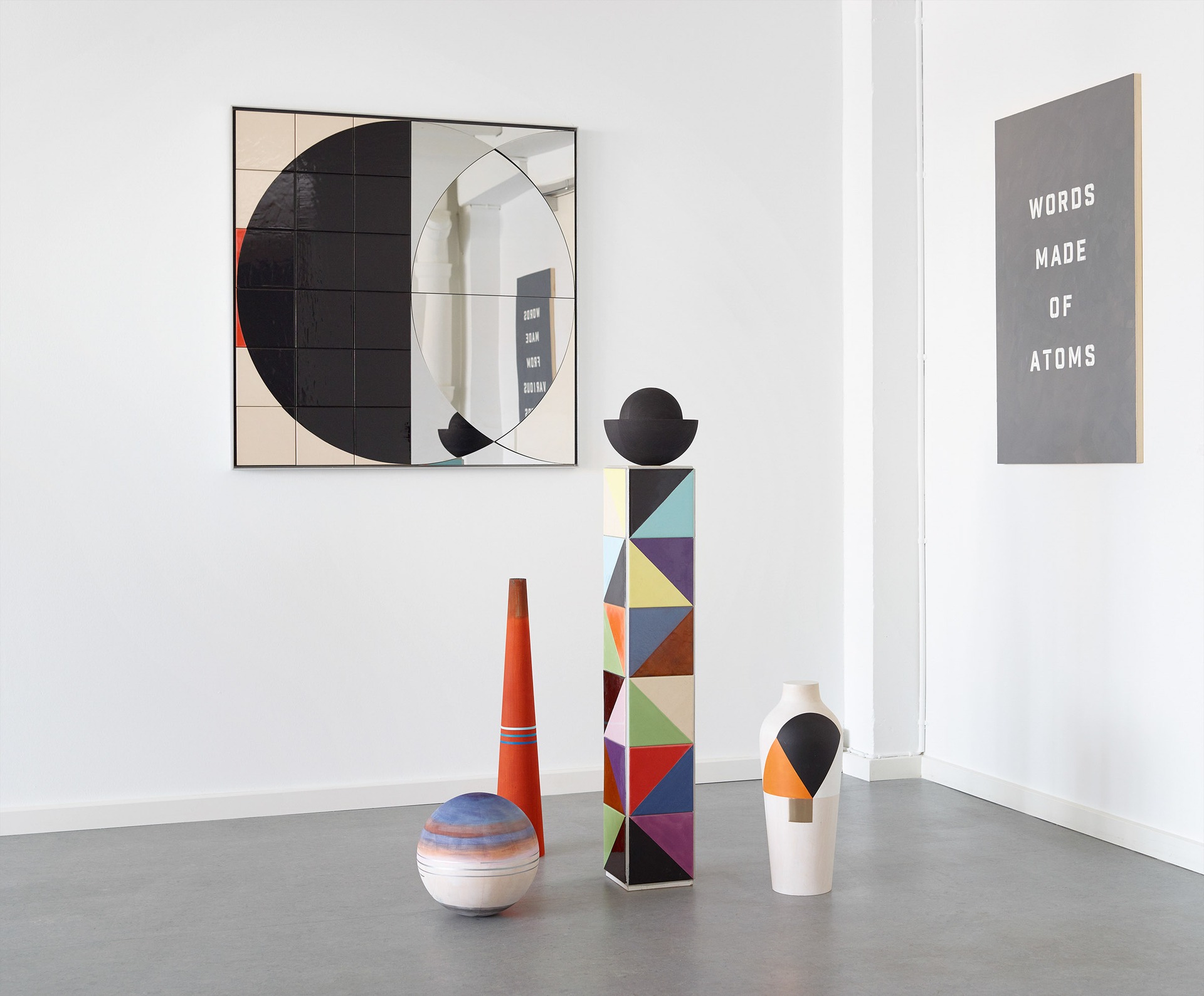 For her curated collection she draws parallels between the stage and the pursuit of art collecting. Like the stage, an art collection presents endless possibilities for transformation, and like a Director, art collectors can create their own narratives through their collection. At the center of the room Bøge has installed Imi Knoebel’s new work ‘Centrum’; a distinctive cross-shaped work symbolically suggestive of a church, whilst Barry Flanagan’s ‘Unihare on Crescent and Bell’ seems to inhabit the space as performer. Frozen in the weightless moment of leaping over a crescent moon and a bell that could have fallen from Knoebel’s church, the hare seems to defy reason and head into the black void of Francisco Sierra’s small painting ‘Untitled’ – into the limitless possibilities of imagination.