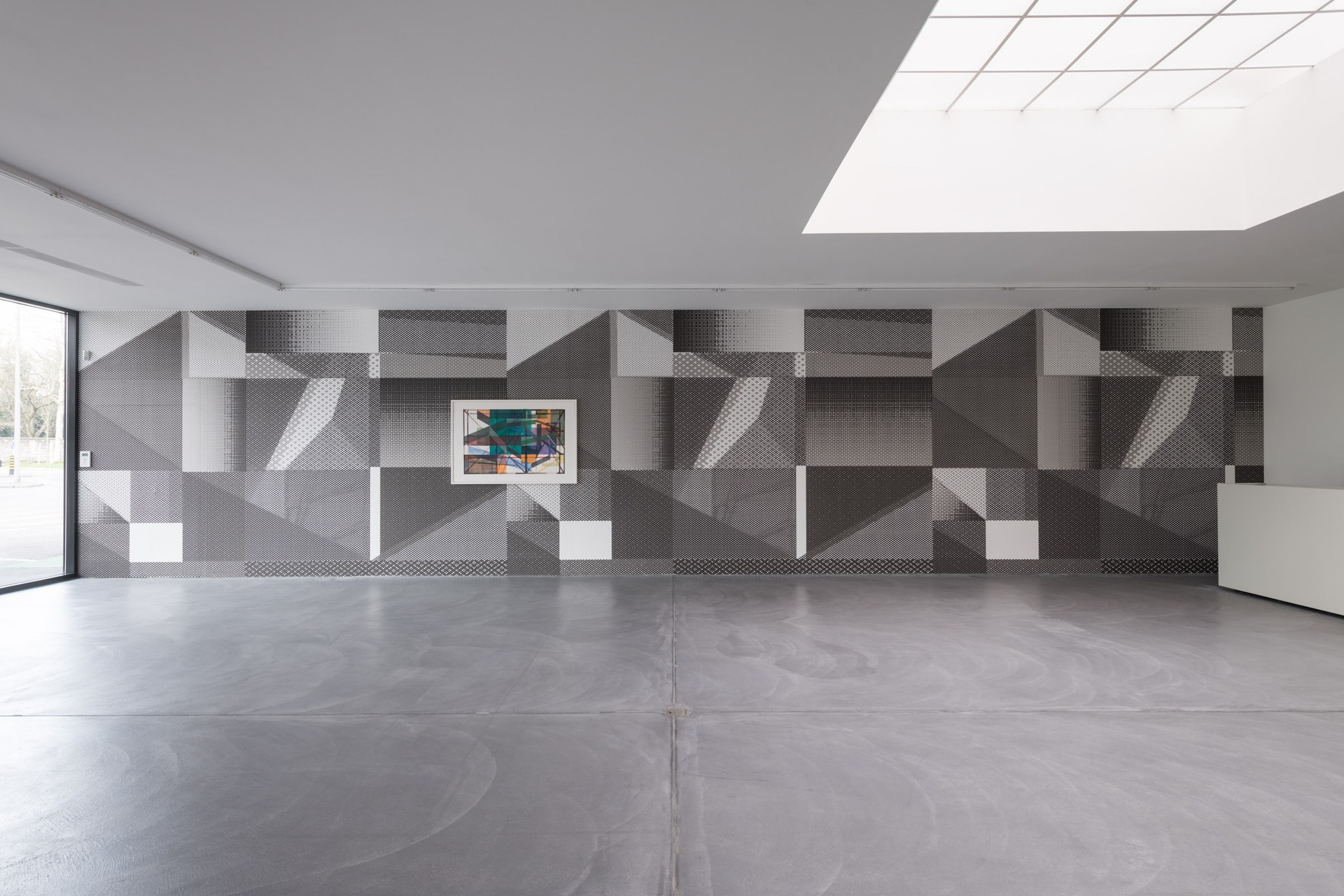 A central work at von Bartha, gate/grid/tree, revisits a motif previously included in Bick’s solo exhibition at Haus Konstruktiv (2017), and is the point of inspiration for a forthcoming public commission by the artist launching in Piccadilly, London. At von Bartha, the repeated structure – a lattice of constructivist shapes referencing both nature and architecture – is presented as “wallpaper”, lining the gallery’s entrance space.