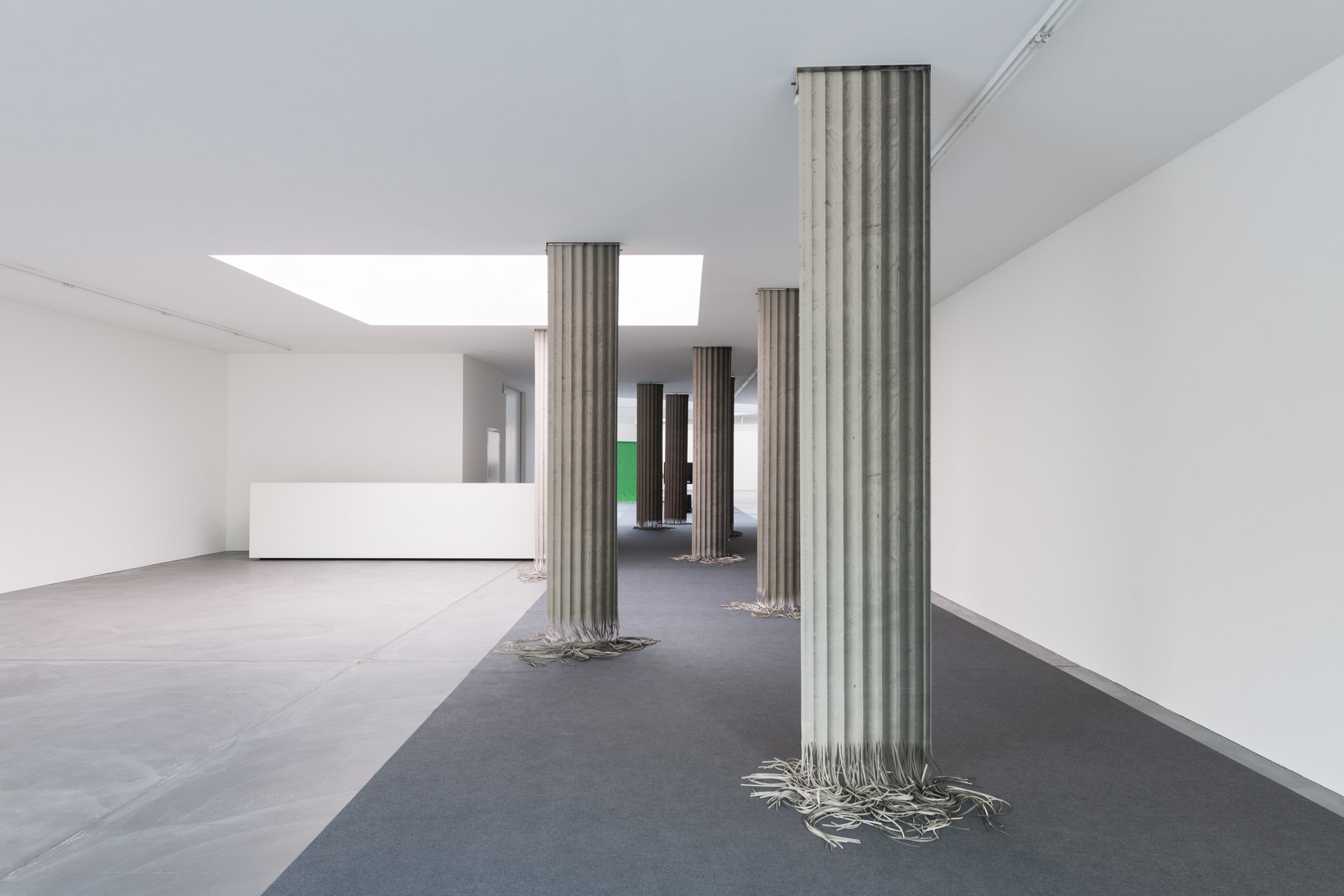 For this exhibition, the artist has created distinctive realms within von Bartha’s 850m² gallery space. The gallery’s entrance hosts *Column Shred *(2015), six hanging floor-to-ceiling prints. Creating the illusion of architectural columns, the installation is in fact a series of paper documents, printed on one side and shredded at the bottom. Here architecture and history are reduced to a printed sourcecode. Yet, these fragile membranes charge the space with a binary function; seen from one side they seem to be architectural structures, seen from the back, blank pieces of paper. Passing through the space, the visitor constantly has to reconfigure their perspective moving through this changing landscape.