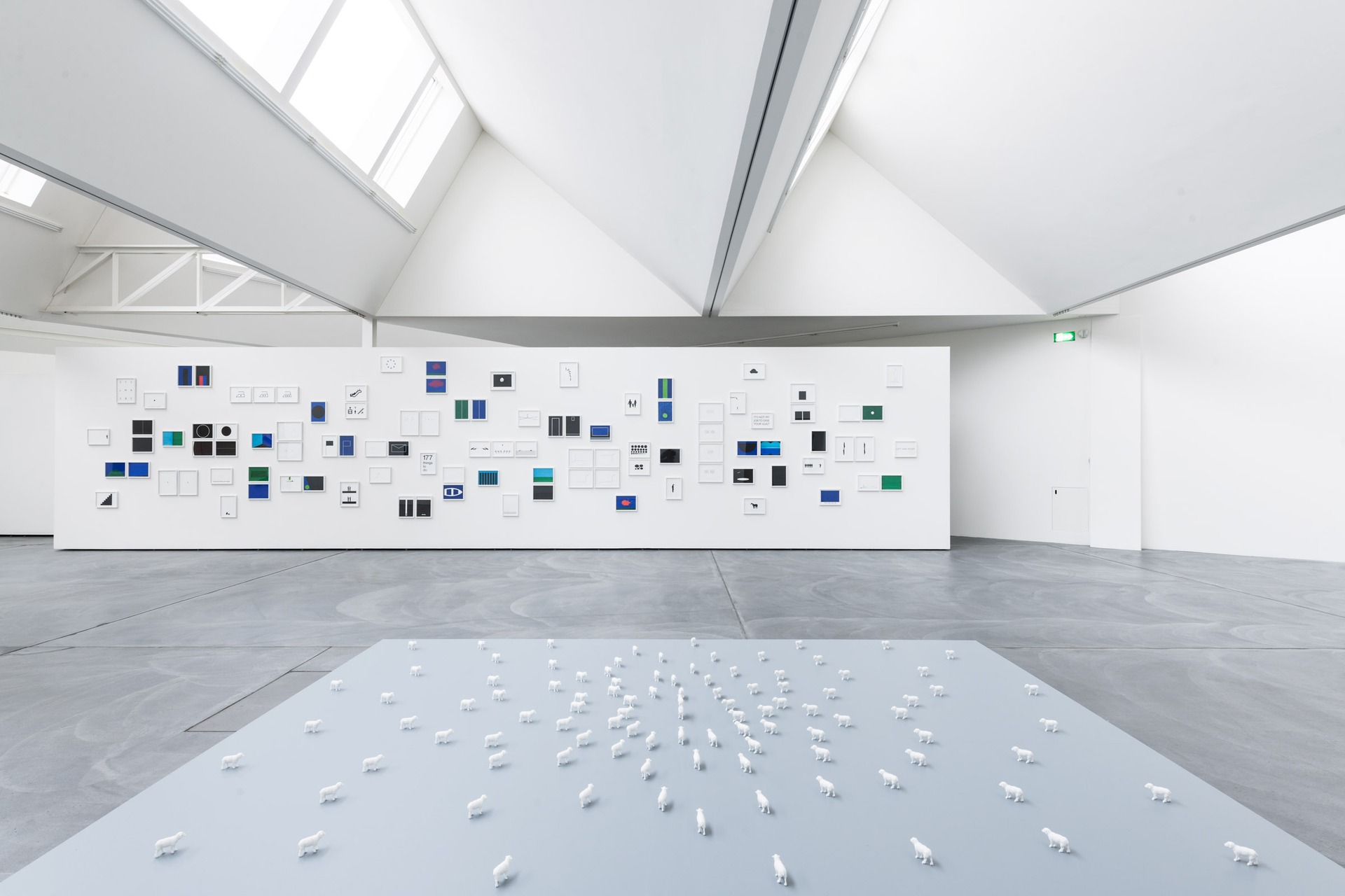 Im hinteren Teil der Galerie dominiert eine grosszügige weisse Wand den Raum. Exakt 100 Zeichnungen sind in russischer Manier gehängt. Die Blätter sind alle mit Permanent Marker oder Filzstift auf Papier gezeichnet, weiss gerahmt und im weltweit einheitlichen Din-A4 Format gehalten. Wood / Harrison präsentieren einem damit eine Art Enzyklopädie, deren eingehende Betrachtung so einige Überraschungen und eventuell tiefere Erkenntnisse bereithält, jedoch sicher jedem/jeder ein Schmunzeln auf die Lippen zaubert. Als Herz der Ausstellung erscheint neben den Zeichnungen die Installation „Sheep Entertainment“, bestehend aus 102 weissen Spielzeugschafen. Die zwei in der Mitte der Herde aufeinander stehenden Schafe erkennt man erst auf den zweiten Blick und findet sich genau damit mitten in der künstlerischen Welt von Wood/Harrison wieder.