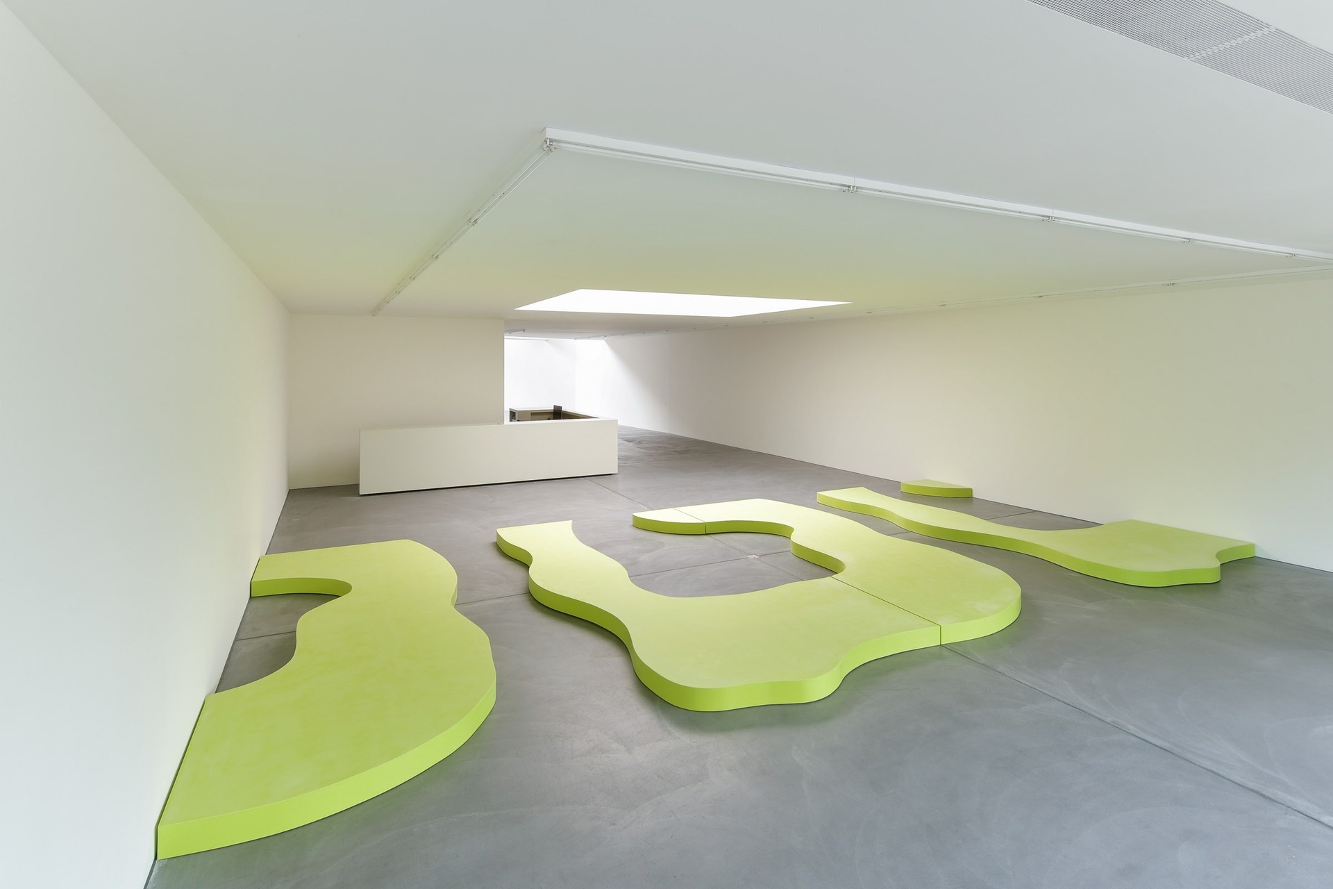 The exhibition at von Bartha expands on the artist’s exploration of the relationship between image and object. In the gallery’s entrance, Metz’s shapes translate into a floor sculpture consisting of three parts. Redirecting the visitors’ way through the gallery space, the pieces invite the viewer to interact with their freestanding forms, navigating around and between them.