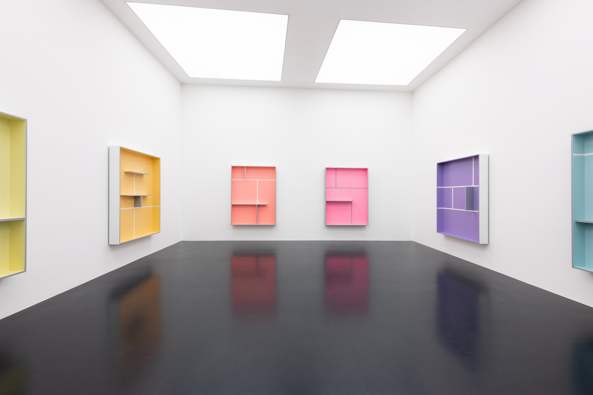 Alcaide has removed most of the shelving to create a shallow depth which implies that – like the sunrise’s descent into the horizon – nothing is ever fixed. Reflecting on the process of deterioration,* Sunset* explores the failure in striving for perfection in an inherently imperfect, and shifting world. Painted in layers of yellows, pinks, purples and blues, it epitomises the notion of a transitory and auspicious moment.