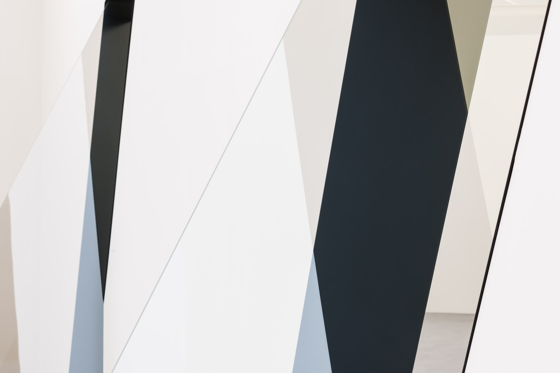 Die eigens für und mit dem Galerieraum entstandene Arbeit P-02 besteht aus zwei trapezförmigen passierbaren Durchgängen, eingebettet in eine Wand. Diese Wand erweitert das bestehende Stützenraster der Galerie und schafft gleichzeitig einen mit Tageslicht beleuchteten rechteckigen Raum auf der einen Seite und einen mit künstlichem Licht beleuchteten dreieckigen Raum auf der anderen. Die trapezförmigen Durchgänge in der Wand sind grundsätzlich identisch, nur dass der Neigungswinkel der matten schwarzen Aluminium-Ausgestaltung des Rahmens der Durchlässe sich unterscheidet. So ist der Winkel an der Gehrung gespiegelt, wodurch ein anderes Profil für jede der beiden Türschwellen auf beiden Seiten der Wand entsteht. Eine ebenfalls trapezförmige Glasebene durchschneidet beide Durchgänge im 90 Grad Winkel. Das Glas ist an der Schnittfläche mit der Wand befestigt, was einen Drehpunkt um seinen Mittelpunkt suggeriert. Ein kühles weißes Bild des rechteckigen Raumes überlagert das warm fluoreszierende des dreieckigen Raumes. Das Glas schwebt über der Grenze der Durchlässe. Die matten Kanten des rahmenlosen Glases verschleiern die Unterscheidung zwischen Raum und Reflexion. Diese Verdopplung bleibt bestehen, da der Betrachter sich durch und um die Arbeit bewegt.