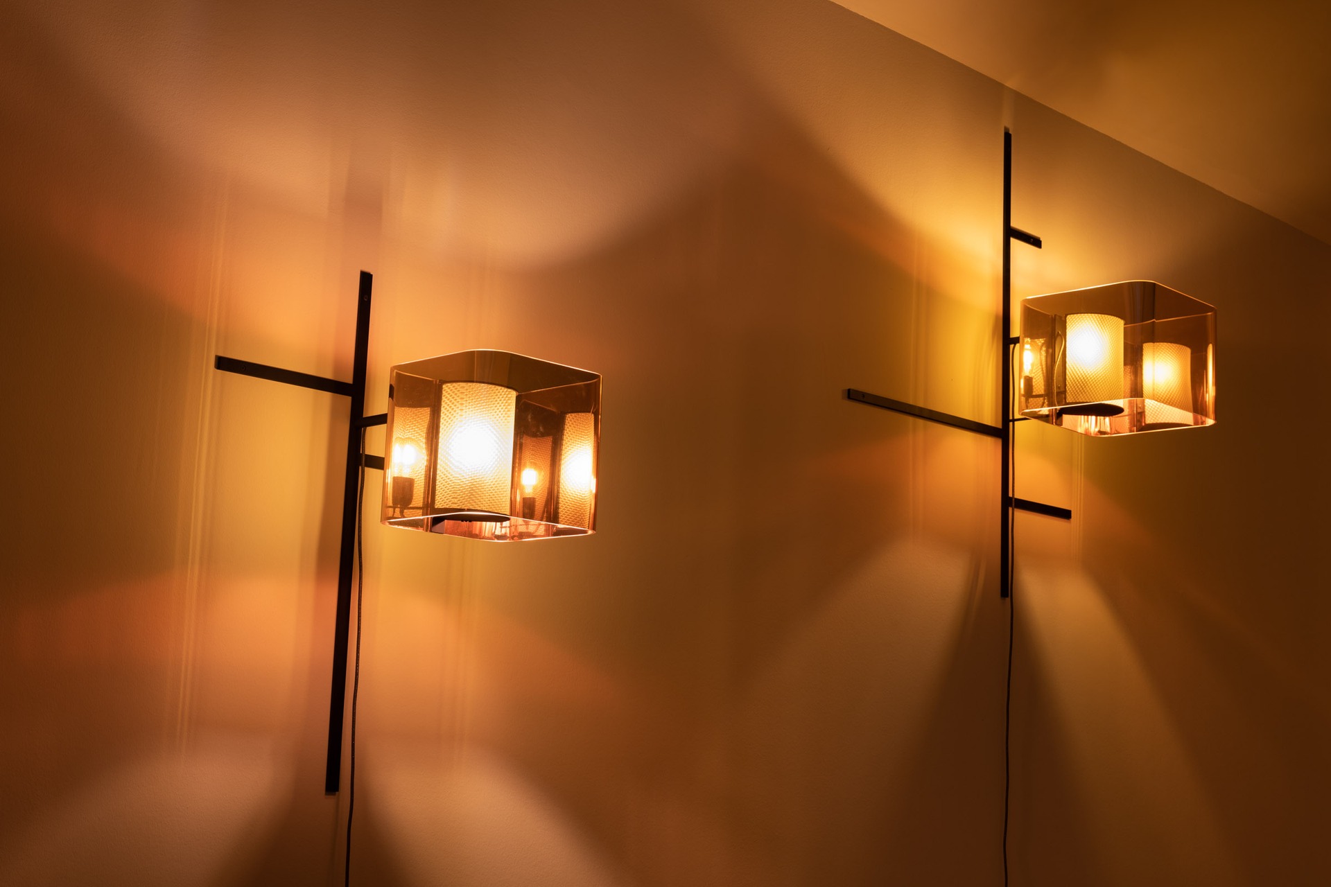 The lamps produce the pleasantly warm light of a sunset, as the title of the work suggests. Ironically, this light comes from the tinted foil inside the lampshades, which was used in office buildings with large windows to protect the interior from overheating due to strong sunlight. When switched off, the copper-colored shades reflect daylight.