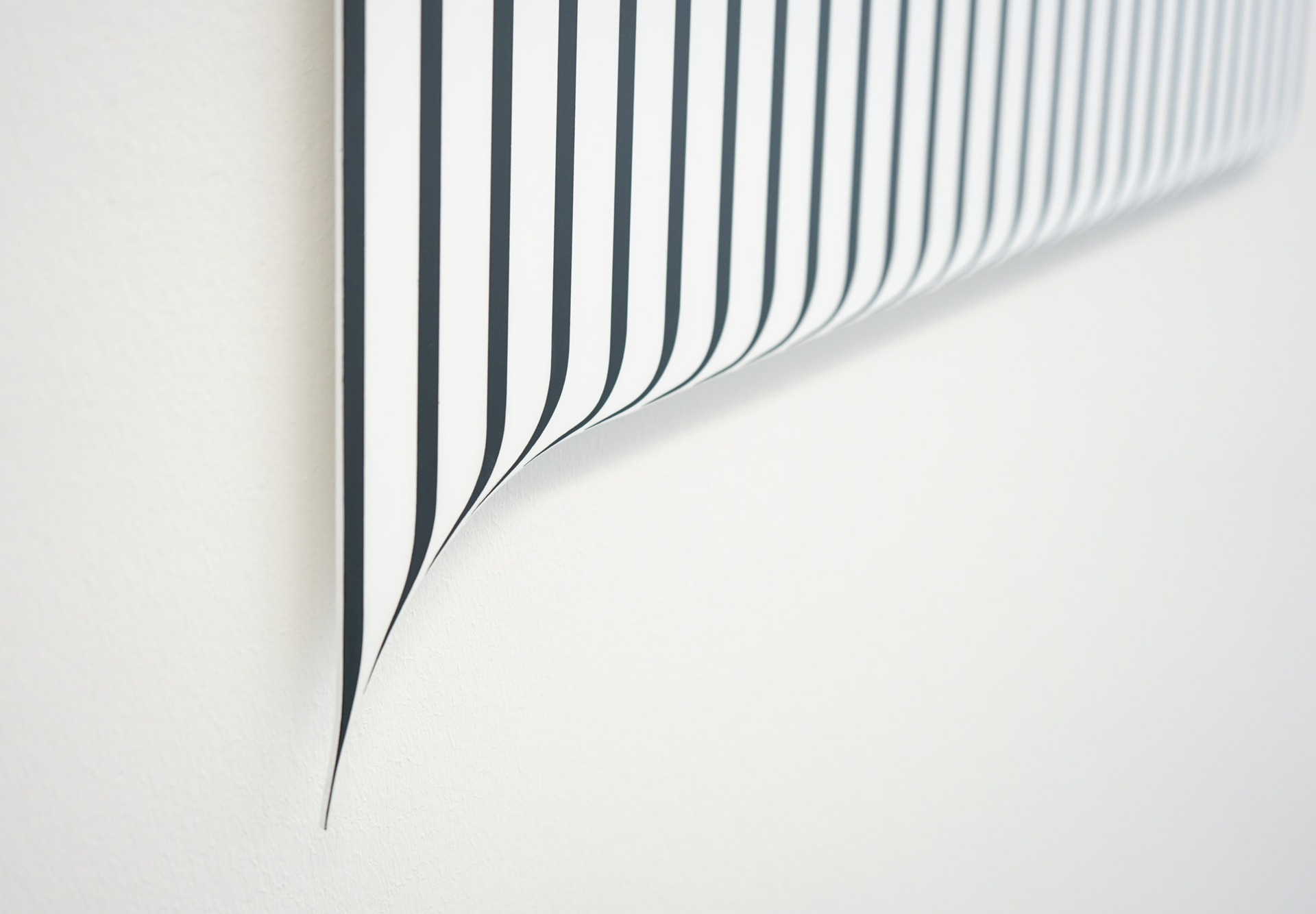 From leaving the square canvas, to freer solutions on wood, to moving from lines to contoured planes, or going beyond 2-dimensionality and working his way into the space, the artist has always explored different visual combinations that oscillate between the linear structure of the surface and the illusory perception of three-dimensionality.