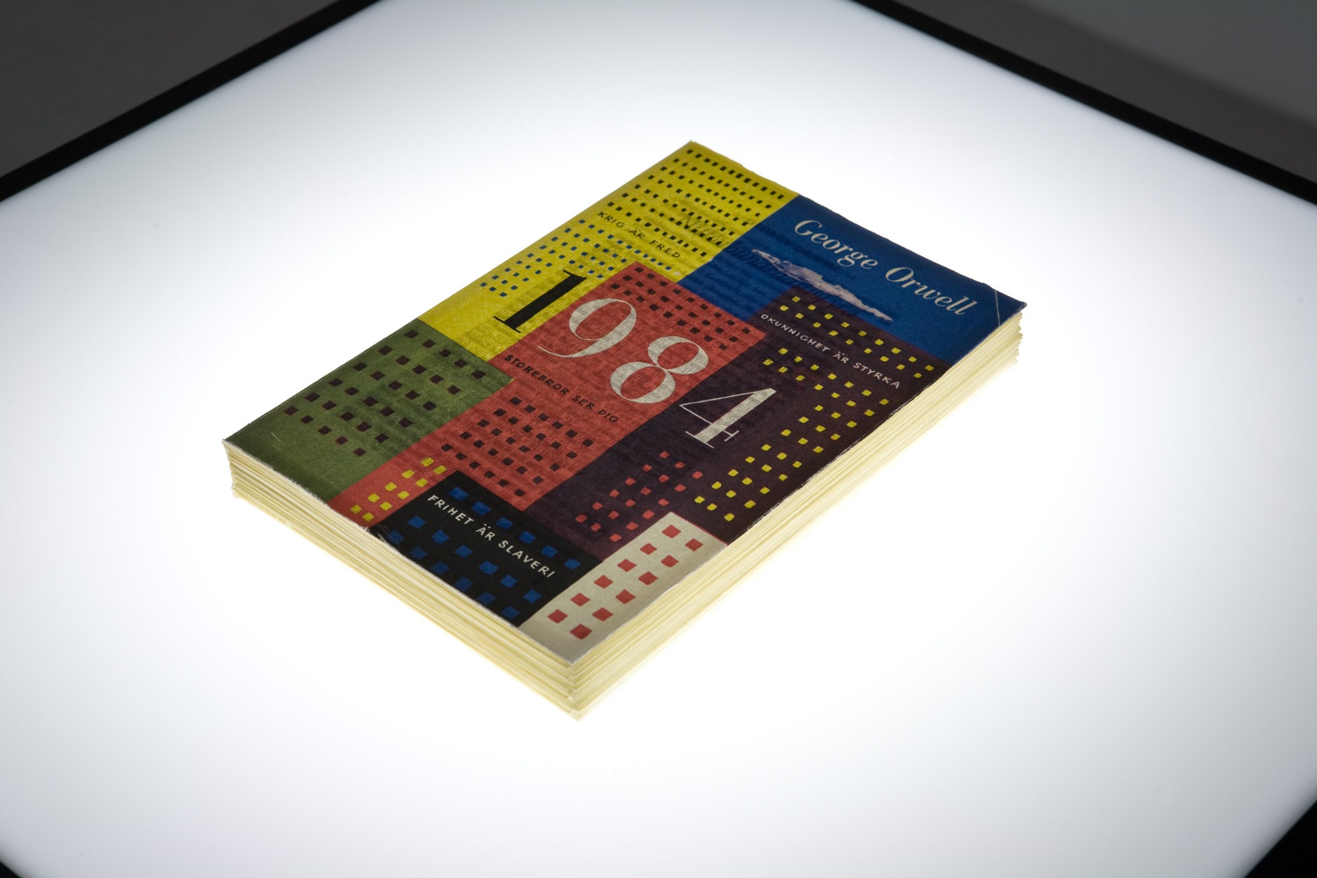 Standing in front of Christian Andersson’s work ‘1950 (1984)’ we are faced with a copy of the Swedish 1950 edition of the world-famous book by George Orwell. It’s presented under glass in a vitrine, resting on a lightbox. Its cover, a colourful graphic design by Olle Eksell, shows a painted illustration of an anonymous, blue-skied cityscape populated by identical skyscrapers, onto which the novel’s infamous slogans are written like neon chapter headings: ‘Freedom is Slavery’, ‘War is Peace’, ‘Ignorance is Strength’. Since 2017, sales of 1984 have steadily increased as phenomena such as public, 24-hour video surveillance, tracing apps and fake news give us reason to reflect on our relationship to society and government. With ‘1950 (1984)’ Andersson condenses past, present and perhaps even future views of these concepts – inviting us to consider how time can shape perception and point of view.