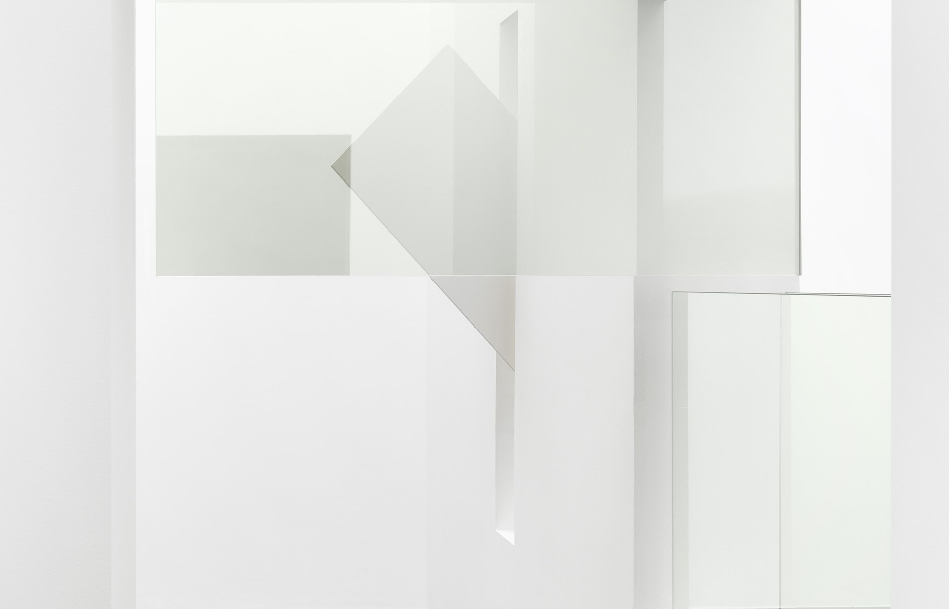 The aim is to inscribe the dynamic of a relay, of message received and transmitted, of cause and effect, into the white, seemingly-neutral wall of the gallery. We rotate a panel that turns a helical screw embed- ded in the wall that in turn opens and closes two planes of a glass window. We activate the wall into something like a switch or a door – open and closed, on and off – though the two halves of the window never quite meet, and the wall is never sealed shut. Emphasis here is on speed, the phasing of movement, and the delay in the flow from one movement to another. For as much as the screw acts as a mechanism of relay, it also controls and regulates the pace of our activation into one of slow and steady repetition: as we rotate the panel, we do not so much act upon the mechanism as we are acted upon, our gesture of rotation incorporated as but one crucial operation in a mechanical array of other crucial operations. We become part of wall-as-automaton that not only demarcates space but marks out and measures time, slowly, steadily, deliberately, again and again.