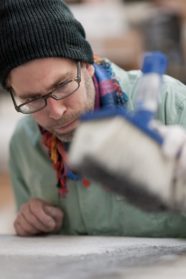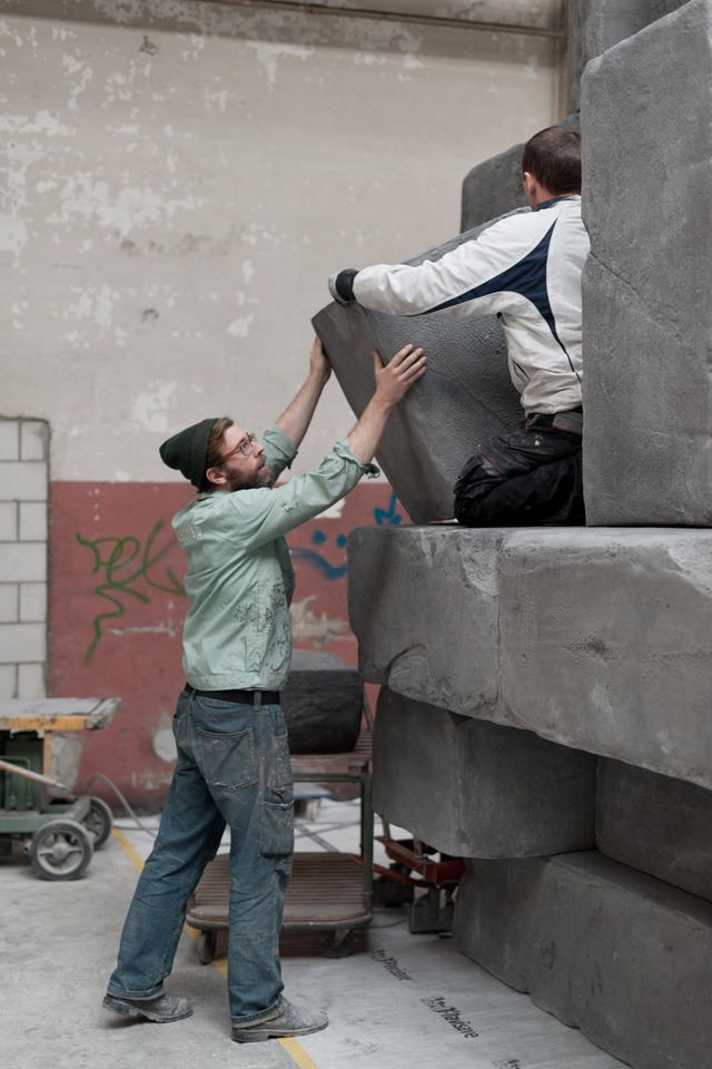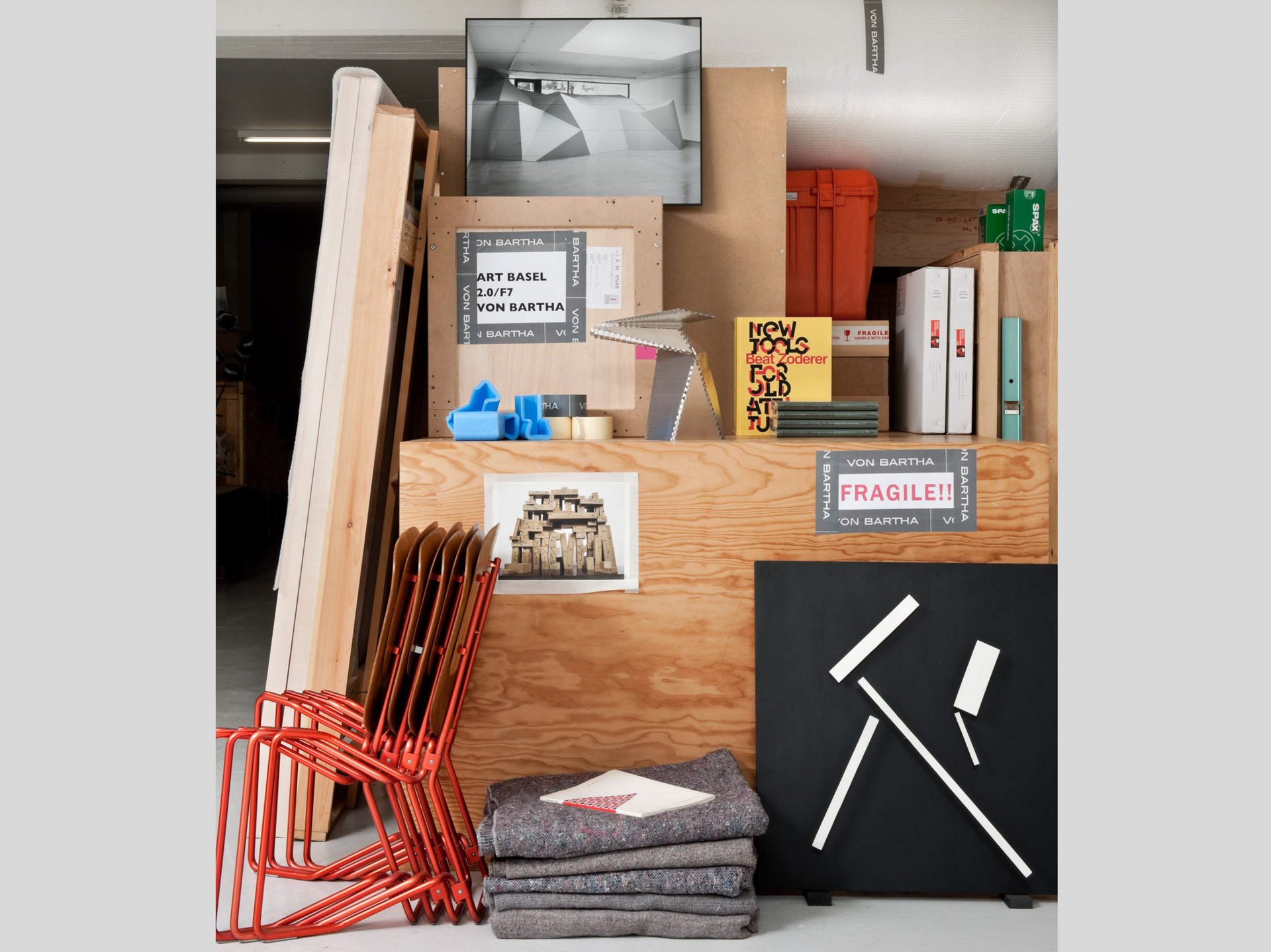 Wooden transport boxes, a water level, packing tape, corner pads and moving blankets are witnesses to the gallery’s everyday life, a large sticker reveals one of the themes of the staging, for Art Basel 2011. An important art fair always means a lot of preparation, but in 2011 two striking large-scale projects by Christian Andersson and Daniel Robert Hunziker had been accepted for Art Basel Unlimited. Meanwhile, the other heads of the gallery were working on a complex group exhibition‚ titled Wall Floor Piece, featuring more than 10 different artists and curated by Reto Thüring at our Basel space.