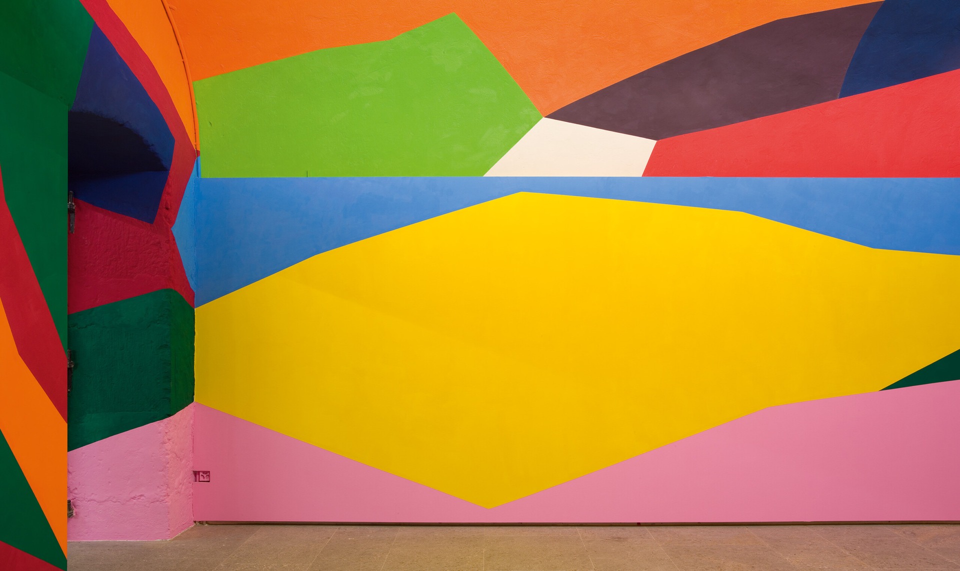 These compositions of all sizes and forms blend into their surroundings, transforming their environment just as much as they are inspired and nourished by it: A diptych enamel painting unfolds on a garage door as it closes or slides open, reflecting its function as an entrance and passage. Other works are immersive and impossible to grasp at a glance due to their sheer size, such as wall paintings over several floors in a stairwell, murals on entire buildings, or a thousand square-meter drawing on the floor onto which visitors step when entering an exhibition space. The appeal of such works lies in the underscoring of the spatial order in which they exist, providing the viewer with a sublime feeling, a here-and-now experience.