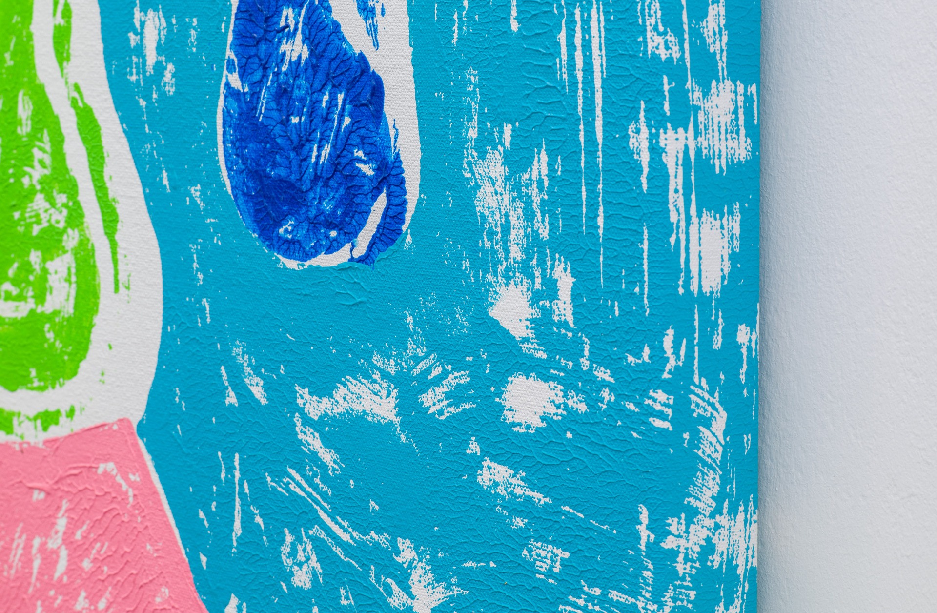 Breuning initially created a (constantly expanding and evolving) vocabulary of recognizable shapes and forms inspired by the natural world peeking in the windows of his isolated studio in upstate New York. Raindrops, trees, tornados, flora, waves, fire and a simple human figure are rendered in their most base form recalling prehistoric cave marking and hieroglyphics as much as our ubiquitous emojis. Carved brusquely out of wood they are pressed against the picture plane with thick, saturated acrylic in a vital update of an artistic process two millennia old and best known from visits to the more historic wings of the world’s art museums. Yet, unlike Han dynasty printed silks or 15th century German woodcuts, Breuning’s works are painterly, grand in scale, and completely of their own time. Within them he manages to maintain a playful ease within configurations that are strongly composed, as images are built up and other shapes appear around them to fill the canvas. The tangible way the paint lifts off the surface and the way the image wraps around the painting’s edges speak to a desire and an admission of their being objects, not merely images, confronting the viewer.