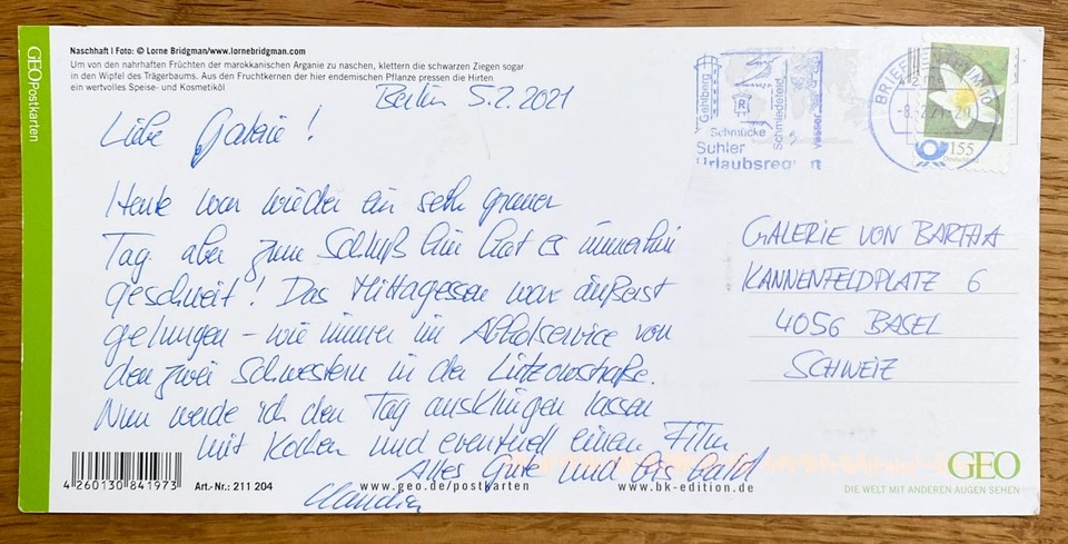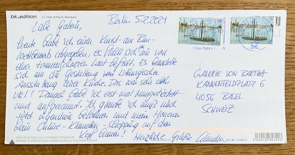 All the way from Berlin came these two jewels from artist Claudia Wieser. As Claudia is a cat and animal lover, we think these two cards are utterly fitting. We are also reminded to work more on our handwriting when we look at these exemplary lines! In case you don’t understand German, Claudia told us about her days in Berlin – how, for example, she submitted an on-site art competition and what a relief that was, and her intention to treat herself by spending some money on online shopping. As we’ve been doing the same during lockdown, we think this is only fair.