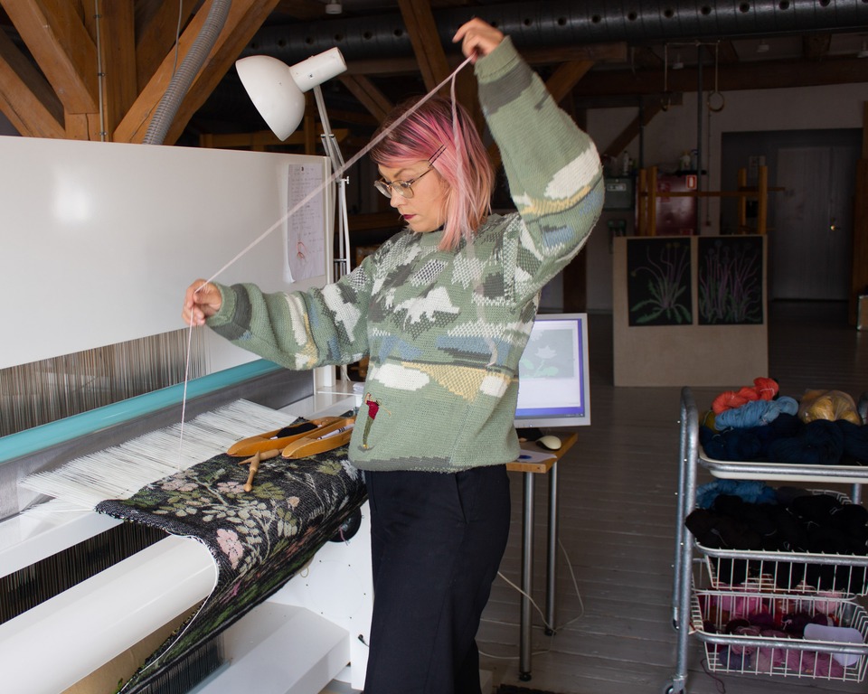 Often, I feel like an object, or a story wants to be told, and it knows which material it wants to be told by, all I have to do is follow its lead. In the case of Norrlands Flora in Colour my mother had a bunch of yarn that she dyed in the eighties, using local plants from the north of Sweden. It made so much sense to use this material to tell the story of the disappearing meadows of Sweden. The history of the material ties in with the motif. You know, the yarn was made from wool from sheep that used to eat grass on the meadows. The beautiful, rich earthy colours were extracted from herbs and wild flowers. When I worked on the loom to weave the yarn into a portrait of the flora of Vigge it felt like closing a circle.
