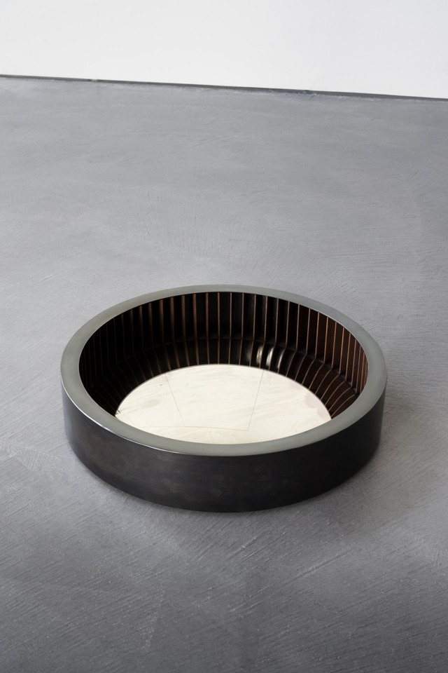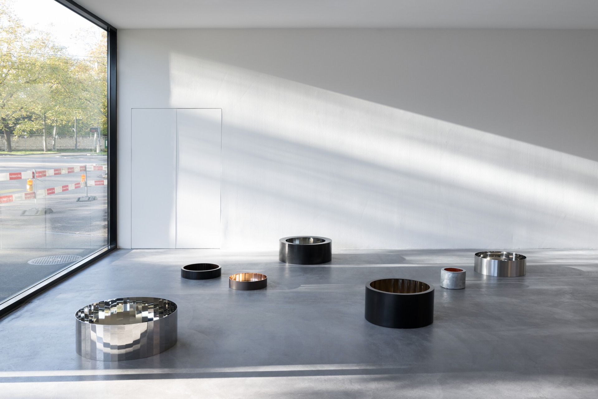 A duo catch my attention. White Tubes 2022 are the first pairings I have seen by Dickinson, and they are all the better for their conversation. Each are translucent cast glass cylinders, infused with smoky veils. Both sit on milky polypropylene bases which also fill, to similar but not quite the same heights, the wells within. One though, had a wafer aluminium foundation, the other a narrow white powder coated aluminium inner rim. So these are twins, but not identical. Anna spoke to me a long time ago about her adventures in the making and there is a playfulness here, a testing or maybe teasing. I like that. Here we have an invitation for comparison within rather than between works.