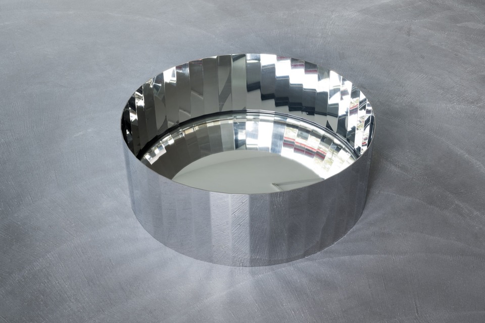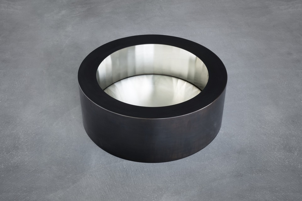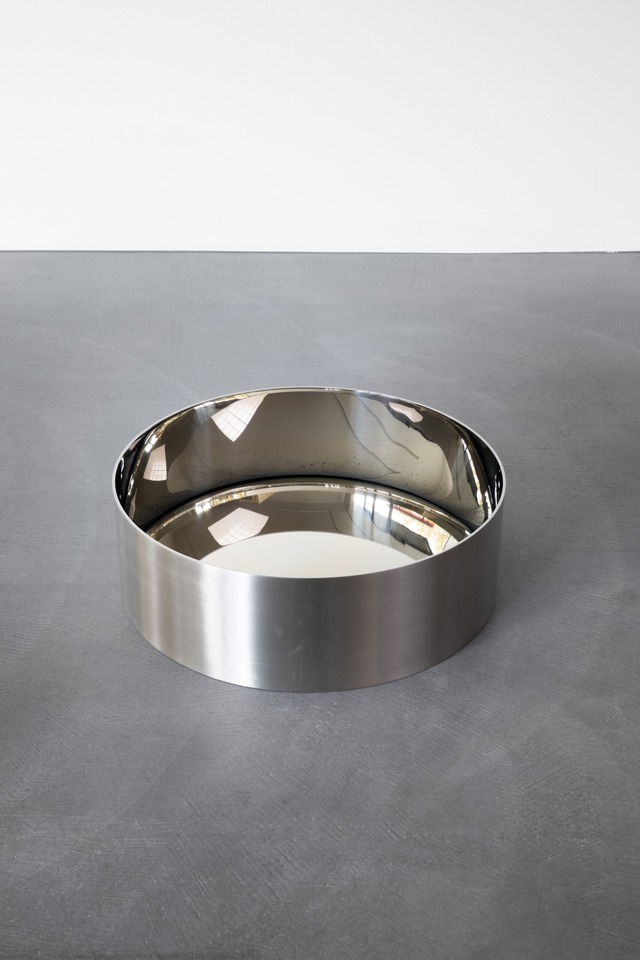 There are ten works here. As before, most are constructions of cast glass, not always but most often combined with other materials: aluminium, polypropylene, corian, steel, nylon, copper and more besides. So far so familiar, but there are significant changes here. Many of the circular works are faceted to their interiors, so their illuminated echo chambers resonate within rather than outside the forms. There is also an enlarged scale. The forms and playful combinations may be familiar but these have grown well beyond the domestic by which we might define an object as a vessel. What we have before us are unashamedly sculpture, set free.