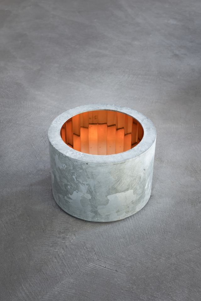 There is one copper element where fins intrude, like a colonnade, to the interior. Another smallish element beams warmth and fire like a furnace from its copper faceted bowels but is safely contained by a galvanised steel envelope with its tightly calming grey zinc snow-crystal encrusted surface.