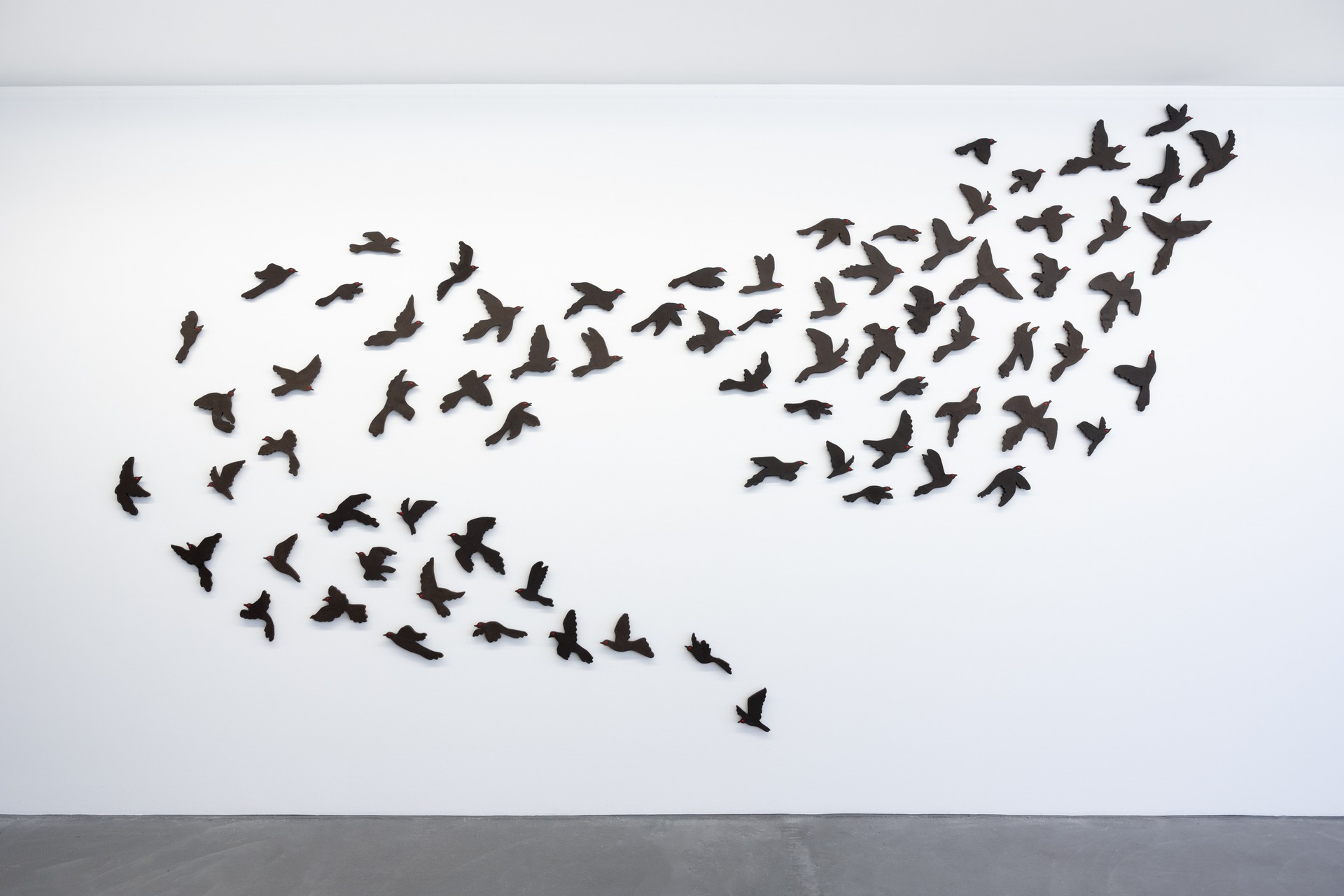 Swedish-born, Copenhagen-based artist Emilia Bergmark celebrates the presence of these legendary birds, and the story of their merciless and untimely demise, with her work EX (Passenger Pigeon), 2025, presented as part of her solo exhibition, Going, Going, Gone., running until March 7, 2026 at von Bartha in Basel. The hand-made ceramic birds grace the gallery’s wall from floor to ceiling. Installed in a configuration reminiscent of the shape-shifting, almost supernatural, amorphous movement of the birds, Bergmark’s passenger pigeons look to confront the human race, seeking eye contact with their iconic carmine-red irises.
